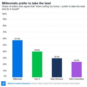 Even so, they are more eager than older generations to do work themselves. When asked whether they prefer to take the lead themselves or rely on guidance from professionals, 57.5 percent of millennial sellers say they are more inclined to take the lead themselves – a higher percentage than older generations. Among Gen X sellers, 40 percent report taking the lead, compared to 29.5 percent for boomers and 24 for the silent generation. This preference may explain why millennials often outdo older generations when it comes to the homework, fixing up and other jobs associated with the home selling process.
