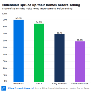 Millennials are more likely than all older generations to fix up their homes for sale. They outdo baby boomers and the silent generation when it comes to painting, redecorating, landscaping, replacing or buying new furniture, and kitchen and bathroom improvements. Ninety percent of millennials do some sort of improvement, compared to 84.6 percent of Gen X, 69.1 percent of boomers and 58.8 percent of the silent generation.