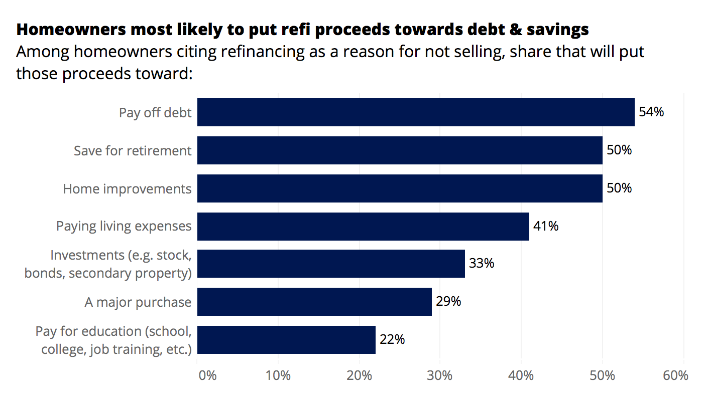 Given the historically low mortgage interest rates that many home buyers and homeowners can enjoy these days, it may come as little surprise that 15% of homeowners report a recent refinance as a reason for staying put — but their planned uses for their newfound financial flexibility are very different. Among respondents that cited a recent refi as a reason to stay put, a majority (54%) said they would use their savings to pay off debt. Exactly half said they would use the savings for home improvements or saving for retirement.